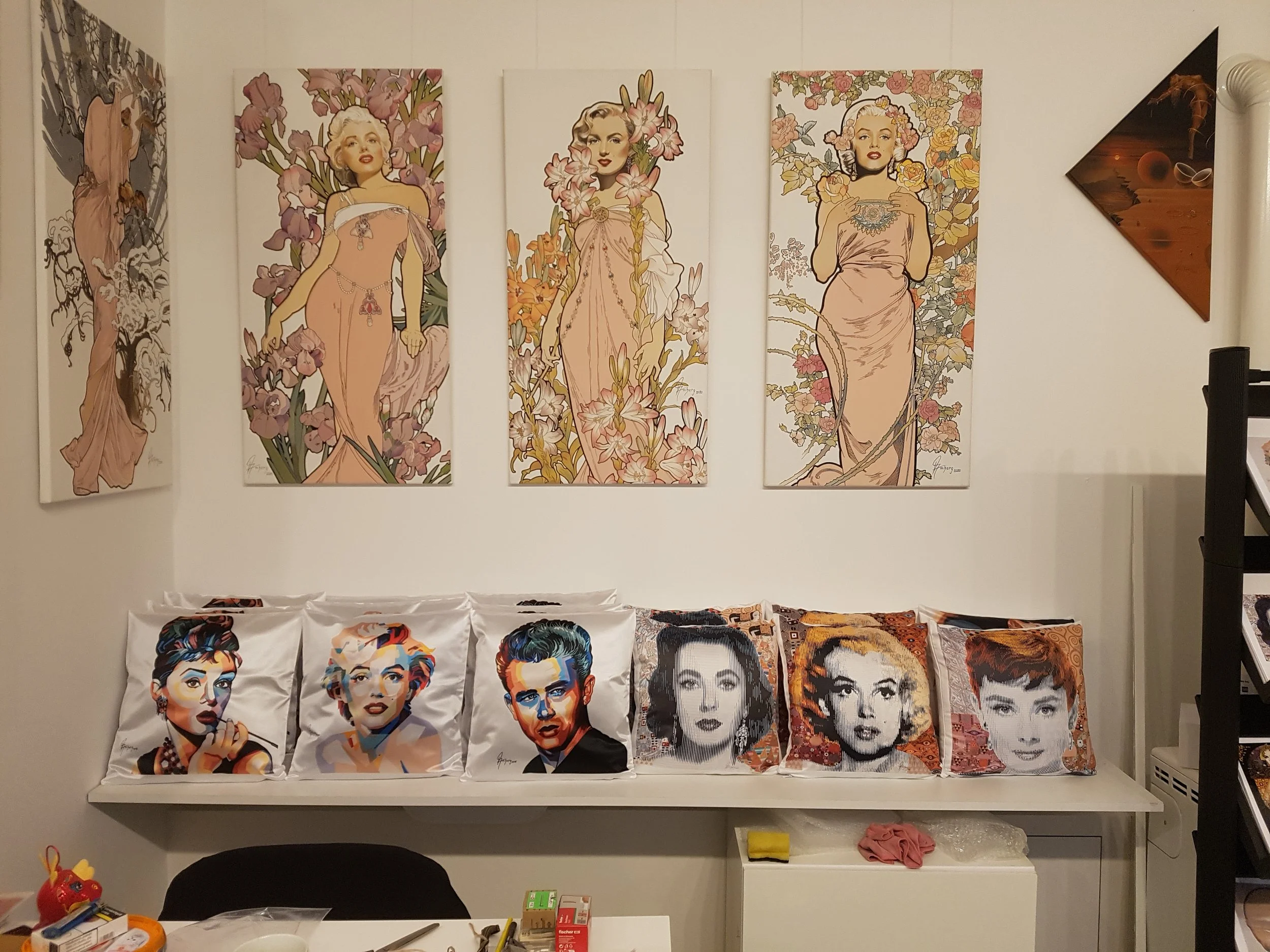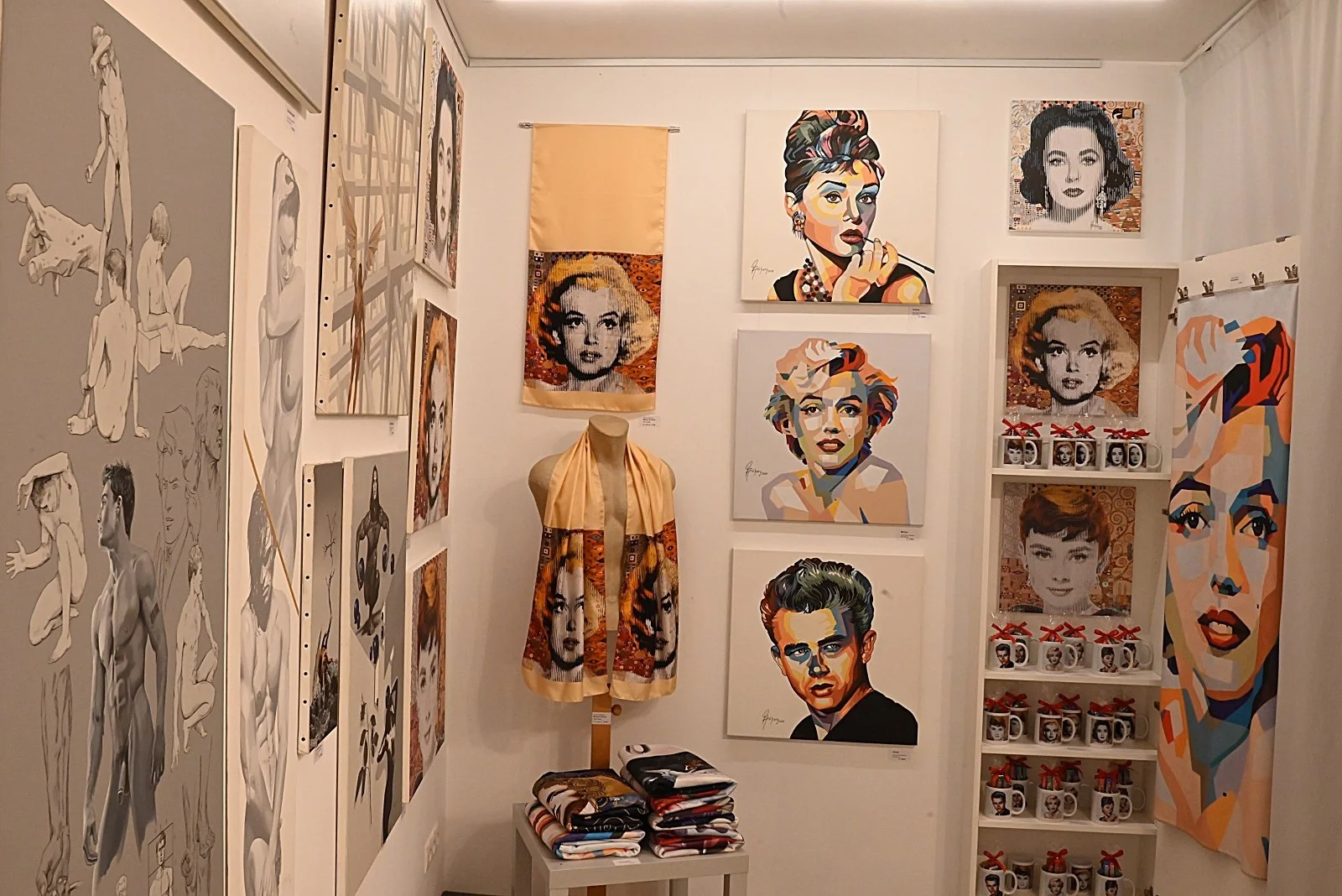 Daniels Motive entfalten sich nicht nur auf der Leinwand. Unter dem Begriff „Designgeschenke“ entstehen Schmuckstücke, Kissenbezüge, Tassen und andere Objekte, die seine Bildwelt in den Alltag holen.